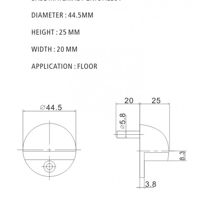 Base Material: Zinc Alloy Diameter: 44.5 MM Height: 25 MM Width: 20 MM Application: Floor