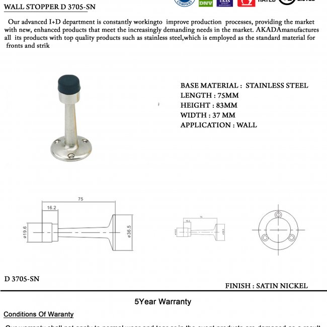 Base Material: Stainless Steel Length: 75 MM Height: 83 MM Width: 37 MM Application: Wall